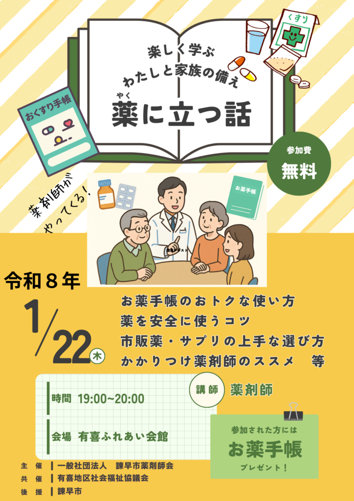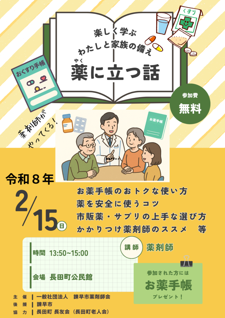 諫早市薬剤師会では、特に医療資源の少ない地域にお住まいの地域住民の皆様に向けて、医薬品に関する正しい知識を啓発するために、出前講座を行います。